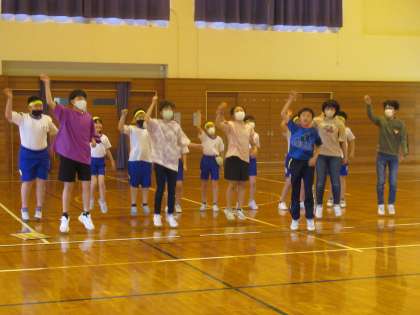 今日は、体育館でそれぞれの団の応援を見合う時間を設けました。