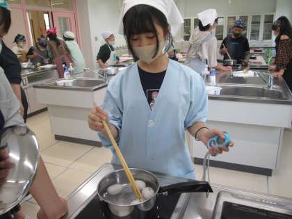 5月16日(月)、今日の家庭科では「おいしい楽しい調理の力」の学習で、ゆで卵を作りました。調理の目的や手順を学習する中で、見通しをもって作業をすることの大切さや、安全で衛生的に調理することの大切さを学びました。そして、ゆで卵づくりでは、3分・5分・10分・15分ゆでる人を決め、ゆでました。切ったときの違いに気付くことができました。「10分のゆで卵が美味しそうだったから、今度は家でやってみよう。」と話す子供もいました。