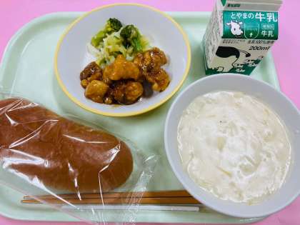 本日の献立は、黒糖コッペパン、鶏肉のマーマレードかけ、イタリアンサラダ、ビーンズポタージュ、牛乳です。