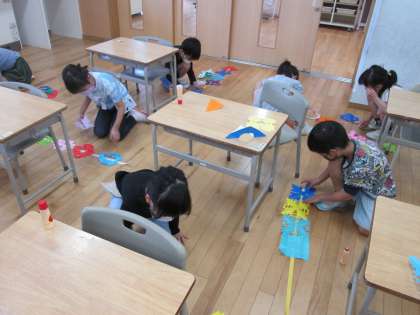 ちょきちょきかざり(1年生) 公開日 2022/05/27 更新日 2022/05/27 1年生 5月27日(金)、図画工作科では先週作った飾りを紙テープに貼りました。 飾りの順番や向きを考えたり、重ねたりして、作品を仕上げました。