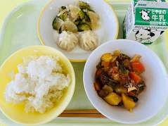 本日の給食は、ごはん、えび包子、華風和え、酢豚、牛乳 です。