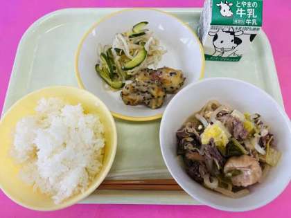 本日の献立は、ごはん、ちくわの南部揚げ、甘酢和え、すきやき、牛乳です。