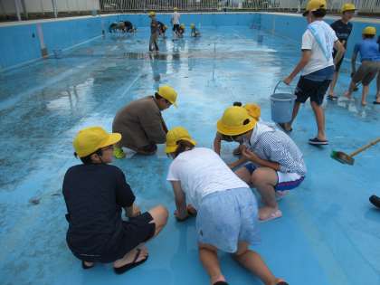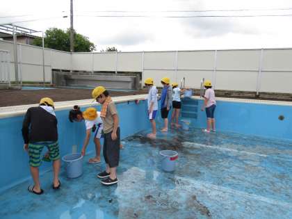 デッキブラシとたわし、ホースをもって真剣な表情でそうじをしていました。