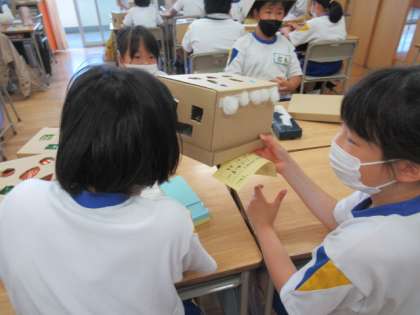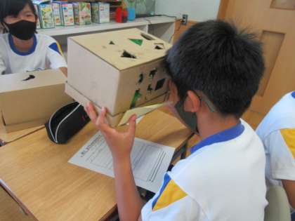 6月9日(木)、今日の図画工作科では「のぞいてみると」の学習でつくった作品を友達と紹介し合いました。自分の作品の見所を伝えたり、友達の作品のよいところを見つけたりしました。「中の作品は変わらないのに、のぞく穴が違うと見える景色が違った。」と話している子や、「友達のアイデアのおもしろさをたくさん見つけられた。」と話している子がいました。