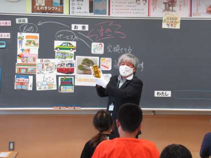 お金には、「ものやサービスと交換できる」「ものの価値を表す」「保存できる」という3つのはたらきがあることを分かりやすく説明してくださいました。子供たちもお金のはたらきについて知ることができました。