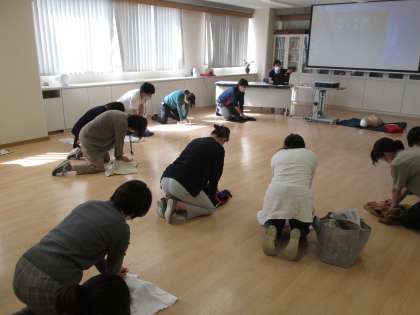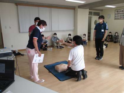 毎年行っている講習会ですが、いざというときにすぐに動けるように何度も確認することが大切です。今年も全員でAEDの使い方、胸骨圧迫の方法を再確認しました。