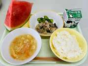 本日の献立は、ごはん、豚肉の塩麹炒め、きゅうりもみ、みそ汁、すいか、牛乳 です。