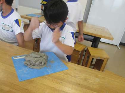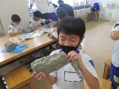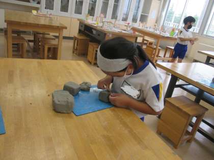 6月14日(火)、今日の図画工作科では「切って、かき出し、くっつけて」の学習をしました。今まで使っていた紙粘土や油粘土とは違う「土粘土」を使って、粘土を切る心地良さや、くっつける楽しさを感じていました。