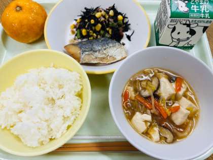 本日の給食は、ごはん、さわらの西京焼き、ひじきのソテー、豆腐の野菜あんかけ、冷凍みかん、牛乳です。