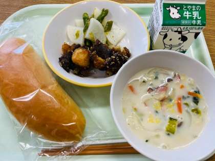 本日の献立は、米粉コッペパン、魚とレバーのえごまダレからめ、かぶのサラダ、中華クリームスープです。