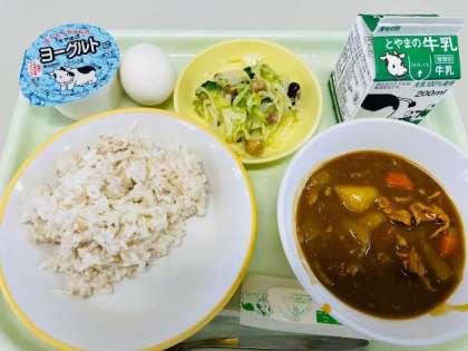 6月17日(金)の給食 公開日 2022/06/17 更新日 2022/06/17 給食室 本日の献立は、麦ごはん、カレー、ゆで卵、ビーンズサラダ、ヨーグルト、牛乳です。 昨日からカレーライスを楽しみにしていた子がたくさんいました。学校のカレーライスは大量の具材を煮るのでうま味やコクが出ます。今日も美味しかったです。