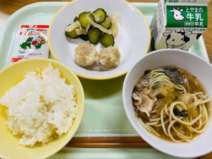 本日の献立は、ごはん、かにシューマイ、大根サラダ、サッポロラーメン、野菜ふりかけ です。