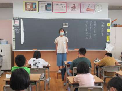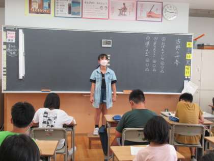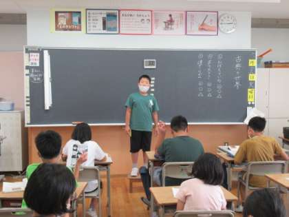 6月28日(火)、今日は「古典の世界(二)」で紹介されている古典の代表作4つの冒頭を声に出して読む発表会をしました。子供たちの人気は、「平家物語」の冒頭でした。一生懸命覚えてきた子供たちが、勇気を出して前で発表しました。リズムを楽しみながら読む姿が素敵でした。