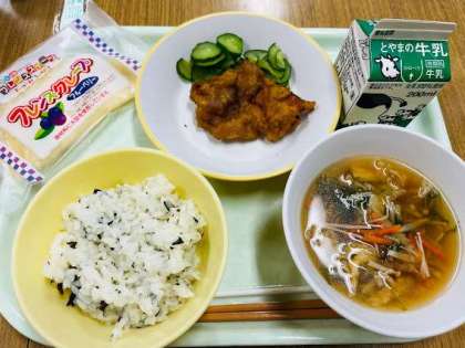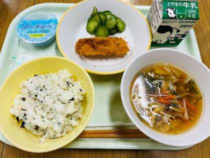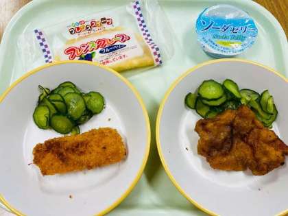 本日の献立はごはん、ポークパコラまたはイカフライ、きゅうりもみ、沢煮椀、ソーダゼリーまたは、ブルーベリークレープ、牛乳です。