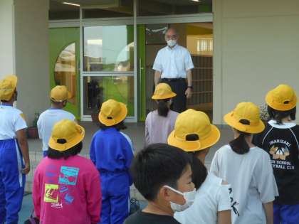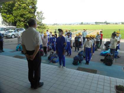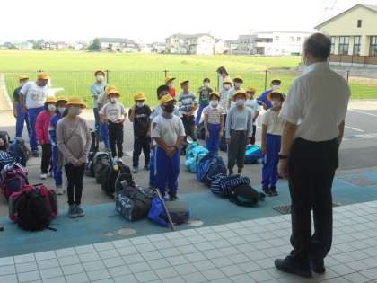 写真は、出発式の様子です。代表の児童の挨拶のあと、校長先生に元気よく挨拶をして出発しました。