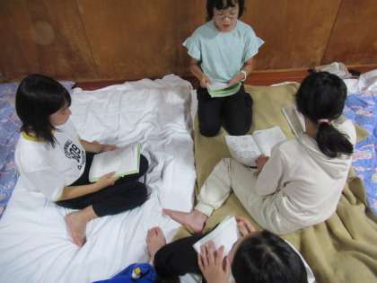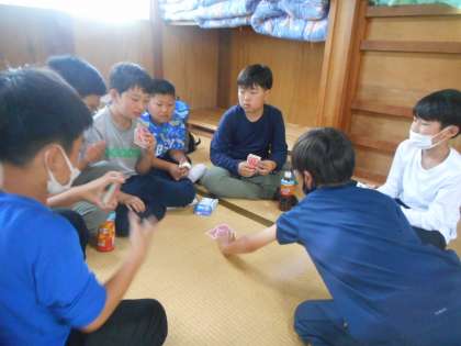 お風呂のあとは、リーダー会議があり、一日目のふり返りをしました。また、友達とお話をしたり、トランプをしたりと落ち着いて就寝まで過ごしました。
