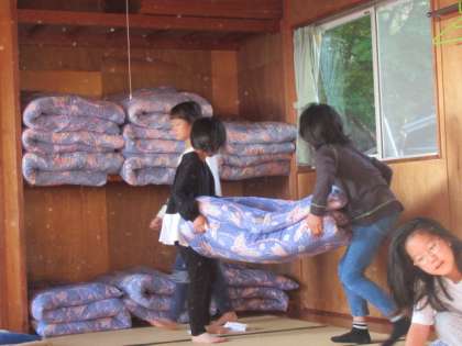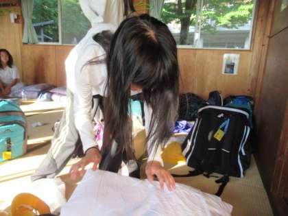 3日目の朝、帰る日の朝は、シーツをたたんだり、使用した施設の掃除をしたりしました。来たときよりも美しくを合い言葉に、みんなで協力して整理整頓をしました。