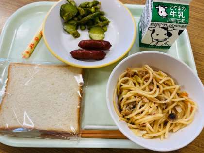 今日の献立は、食パン(減量)、ツナとキャベツのスパゲティ、あらびきウィンナー、アスパラサラダ、棒チーズ、牛乳 です。