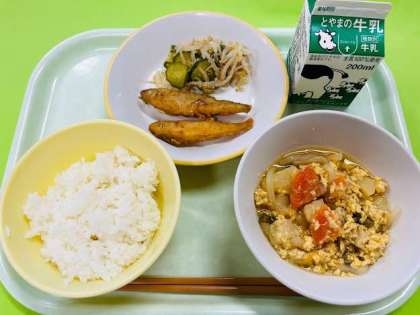 本日の献立は、ごはん、わかさぎフリッター、甘酢和え、高野豆腐の卵とじ、牛乳 です。