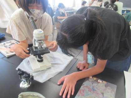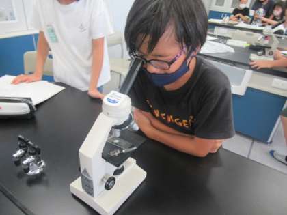 8月31日(水)、今日はヘチマのおしべを触ったときに手についた粉を顕微鏡で観察しました。その正体は花粉で、顕微鏡で拡大されたものを見て、「黄色いお米のようだった。」とつぶやいていました。顕微鏡の使い方も正しく使えるように練習しました。