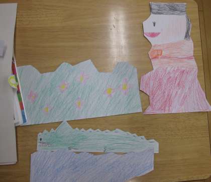八つ切り画用紙をいろいろな形に切り、その画用紙が何に見えるか向きを変えて考えました。画用紙を組み合わせて、お話を作る様子も見られました。