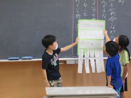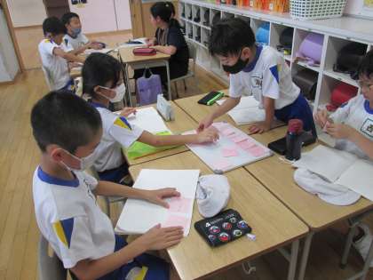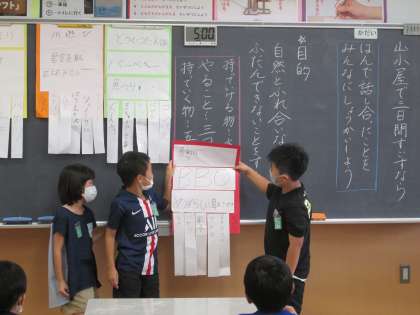 国語科では、「山小屋で三日間過ごすなら」の学習をしていました。山小屋で三日間過ごすならやりたいこと(3つ)、そのために持って行く物(5つ)をグループで話し合いました。