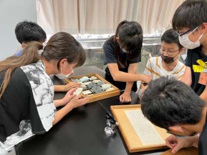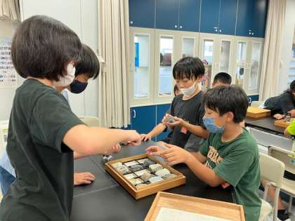 子供たちは、資料を一つ一つ手にとって重さや色、感触などをグループで伝えあい、特徴を捉えていました。
