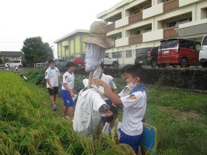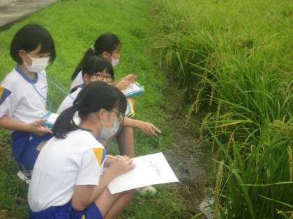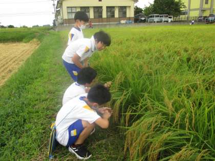 月末の稲刈りを前に、学校田の観察に行きました。久しぶりに稲の様子を見て、成長に驚いたり、実った稲穂を嬉しそうに観察したりしていました。収穫が楽しみになりました。