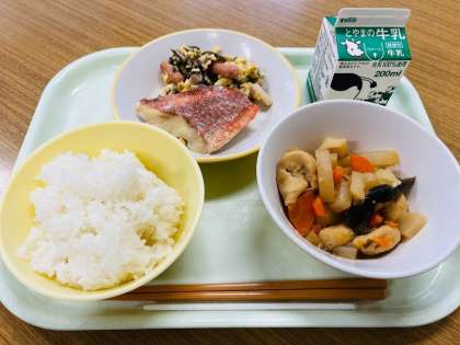 本日の献立は、ごはん、赤魚の塩焼き、卵ときくらげの炒め物、炊き合わせ、牛乳です。