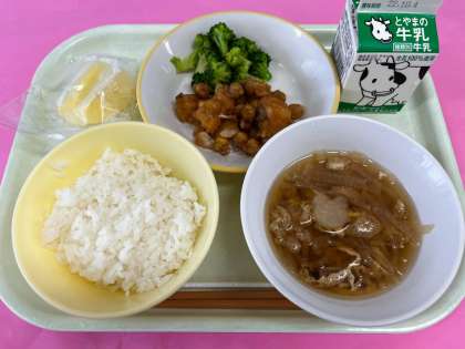 今日のゆでブロッコリーは塩だけの味付けです。魚とひよこ豆の甘辛めは味がしっかりついているので、ブロッコリーは薄味で提供しました。低学年で苦手だから1つだけ、という子もいましたが、少しずつ食べてみようという気持ちが嬉しいです。