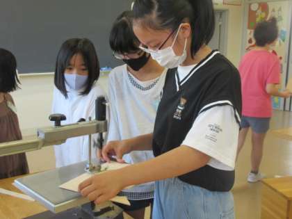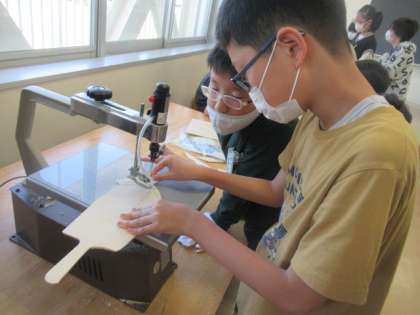9月29日(木)、図画工作科では「糸のこスイスイ」の学習をしています。板を糸のこで切り、自分だけのホワイトボードを作ります。初めて電動糸のこを使う子供たちでしたが、安全に気を付けて切ることができました。下書きをした線通りに切ることに苦戦している様子もありましたが、コツをつかんで上手に切ることができました。また、思い描いていた線にはならなくても、その切り口の良さを感じる子供もいました。