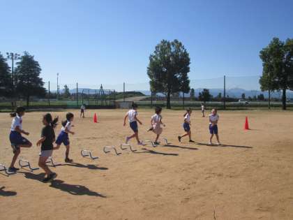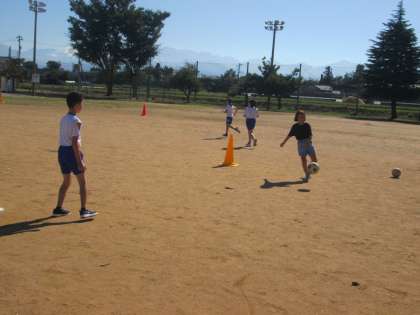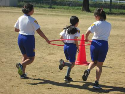 9月30日(金)体育の学習で楽しみながら、身体中を動かしました。写真の他には、バッティングゾーンをつくりました。1番人気でしたが、普段慣れない動きに苦戦していました。