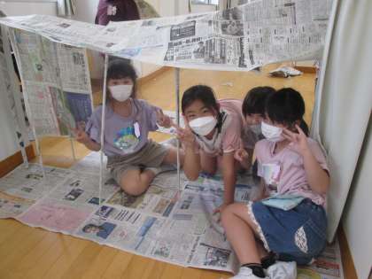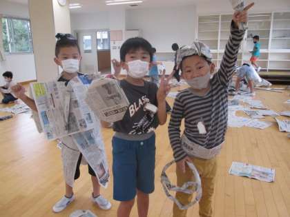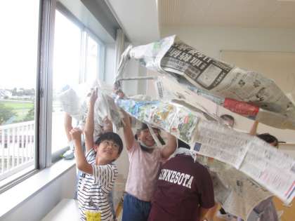図工の学習で「しんぶんとなかよし」に取り組みました。今日は、風が吹いていたのでひらひらと風になびかせたり、かっこいいマントや帽子にしたり、家を作ったりして、いろいろな方法で新聞紙の形を変えて、楽しみました。新聞となかよし、友達ともなかよしになれたようです。