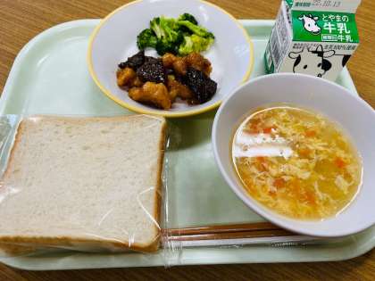 本日の献立は 食パン、鶏肉とレバーのマーマレードからめ、ゆでブロッコリー、コーンと卵のスープ です。