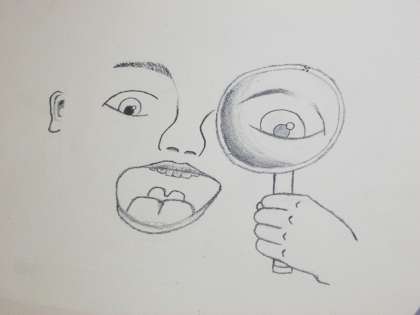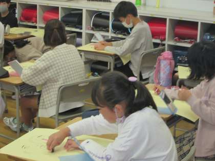 図工の学習で、自分の顔を鏡で見ながら丁寧に描いています。