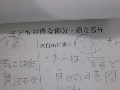 先週の第1回から本日第2回にかけて、写真のように大人と子供について考えました。話合いの場面では、それぞれが思いを膨らませて話をする姿が見られました。子供たちの思いを基に、4年1組で1つの映像作品を創っていきます。