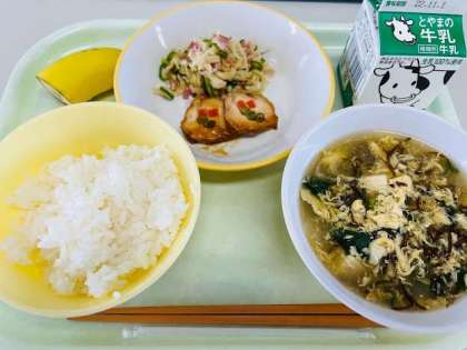 本日の献立は、ごはん、野菜の肉巻き、切り干し大根のペペロンチーノ、もずくと卵のスープ、バナナ です。
