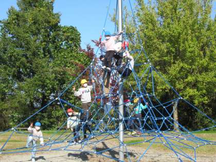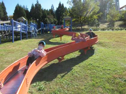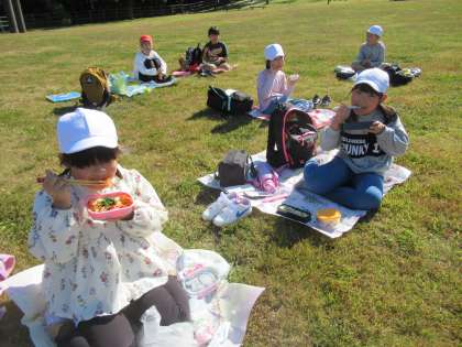 10月28日(金)、桃山運動公園へ移動し、昼食と午後の活動を行いました。とても天気が良く、おいしくお弁当を食べることができました。その後、秋見つけや遊具遊びを楽しみました。