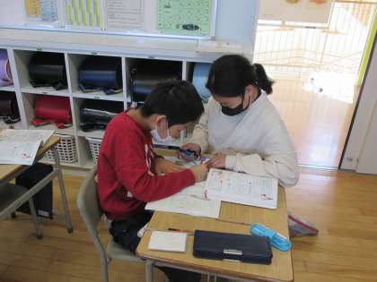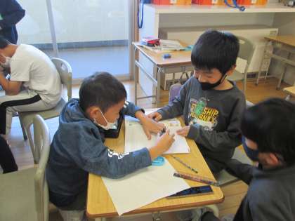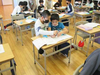10月28日(金)、算数の学習ではコンパスを使って様々な形をかくことに挑戦しました。コンパスを昨日から使い始めたので、「かけない!」「分からない!」という声が飛び交っていましたが、気が付くと互いに教え合い、助け合い、授業の最後には全員が難しい形をかくことができました。自然と教え合える温かい子供たちの姿が本当に素敵です。
