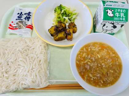 11月11日(金)の給食 公開日 2022/11/11 更新日 2022/11/11 給食室 日の献立は、ソフト麺の肉みそかけ、花野菜サラダ、大学芋、味付け小魚、牛乳 です。 ※今日の花野菜サラダで使用予定だったカリフラワーは物資調達の都合によキャベツに変更になりました。
