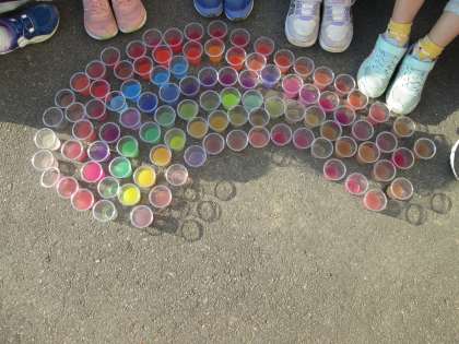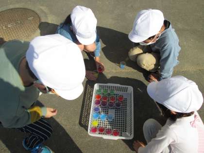 赤・青・黄の色水をそれぞれ混ぜたり、水で薄めたりしながら、できた色を楽しみました。たくさんの色水をつくった後には、みんなで虹をつくりました。