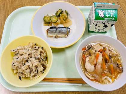 本日の献立は、ひじきごはん、さんまの生姜味、華風和え、かしわうどん、牛乳 です。
