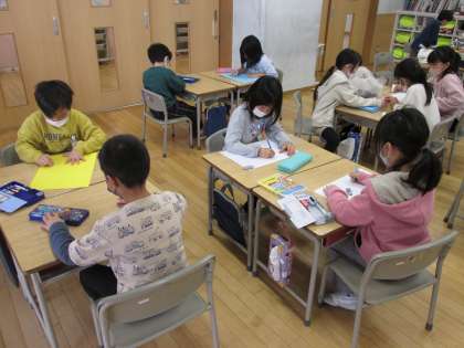 あきと あそぼう(1年生) 公開日 2022/11/22 更新日 2022/11/22 1年生 11月22日(火)、生活科「あきとあそぼう」では、つくったおもちゃで遊ぶ計画を立てました。 グループに分かれて、みんなで遊ぶ準備をしています。今日は看板作りをしました。楽しく遊ぶルールも考えていきます。