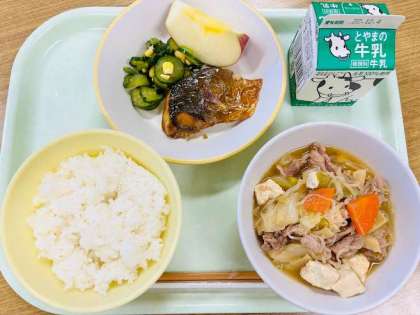 本日の給食は、ごはん、あじのみりん焼き、コーン和え、豚肉と野菜の甘辛煮、りんご、牛乳 です。