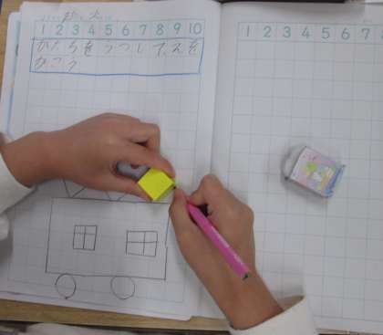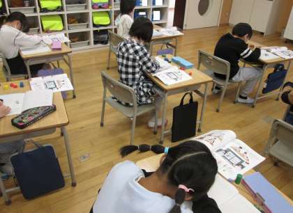 11月29日(火)、算数科「かたちあそび」の学習では、形をうつして絵を描きました。