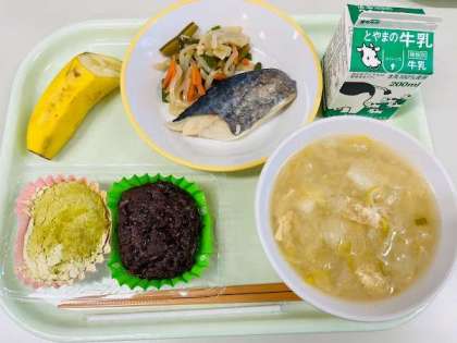 本日の献立は、おはぎ(きなこ・あんこ)、鰆の塩焼き、茎わかめのきんぴら、具だくさん汁、バナナ、牛乳 です。