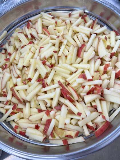 サラダのりんごも野菜に合わせて拍子木切りにしました。