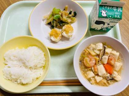 本日の献立は、ごはん、にんじんシューマイ、大根ナムル、えびと豆腐のうま煮、牛乳 です。