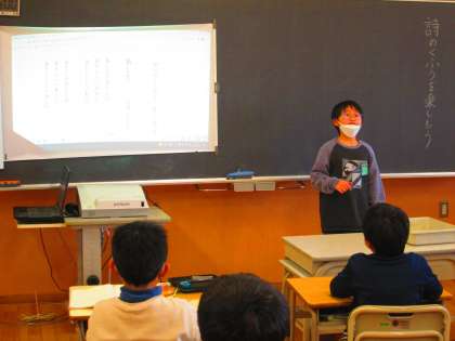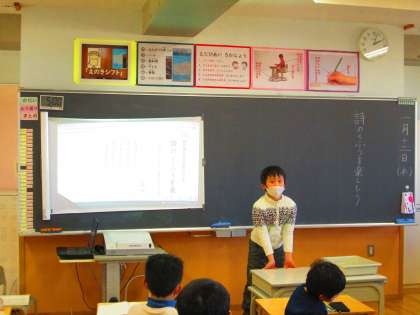 1月12日(木)、国語で「詩のくふうを楽しもう」の学習をしました。頭文字をつなげると言葉が表れる詩、声に出して読むと楽しい詩、見て楽しむことのできる詩の中からお気に入りの詩を選び、暗唱しました。リズムよく読む楽しさを味わうことが出来ました。