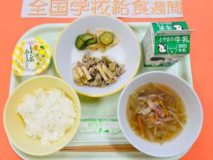本日の給食は、ごはん、ピーマンマンの炒め物、かぶの中華和え、春雨スープ、レモンムース、牛乳 です。